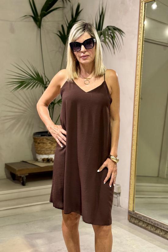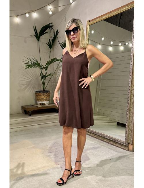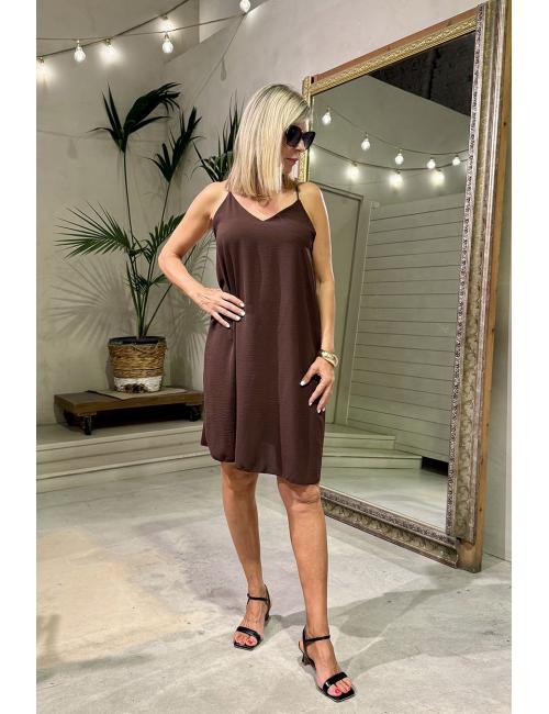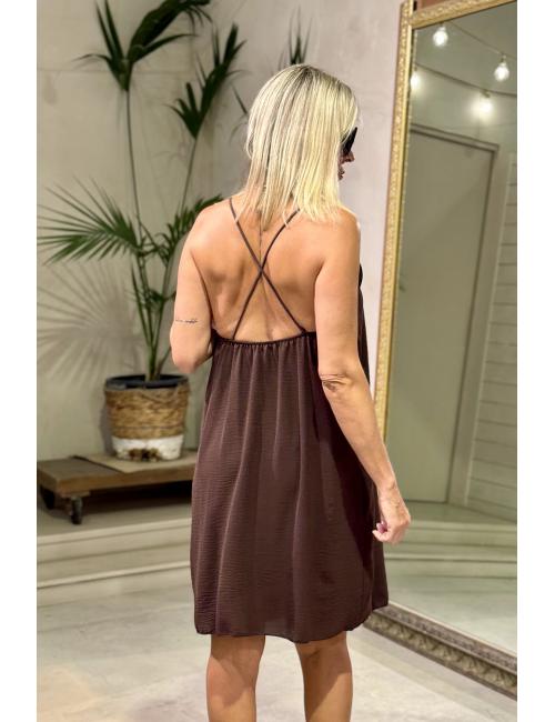 Short dress with thin straps that cross at the back. Flowing crepe fabric.