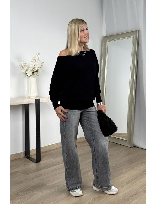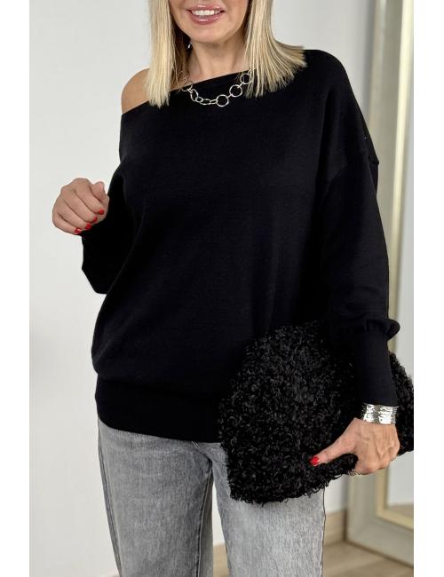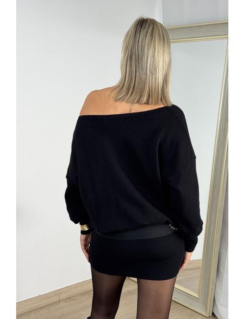 Fine knit dress with long sleeves and a boat neck. Oversized top and ribbed elasticated cuffs and waistband. A striking, versatile garment that will give you lots of options for both party looks and more relaxed outfits.
