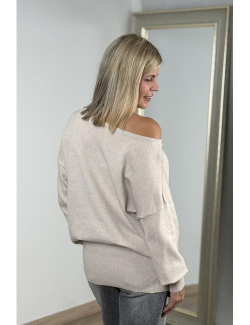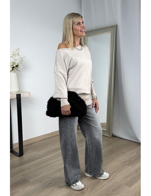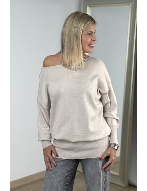 Fine knit dress with long sleeves and a boat neck. Oversized top and ribbed elasticated cuffs and waistband. A striking, versatile garment that will give you lots of options for both party looks and more relaxed outfits.