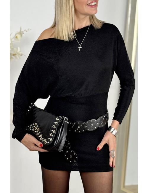 Short, long-sleeved dress made from shiny stretch lurex knit fabric. Batwing sleeves and semi-boat neckline.