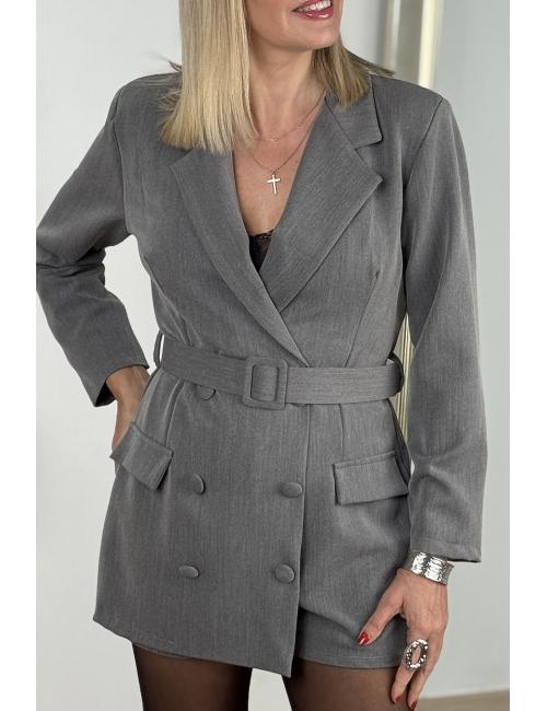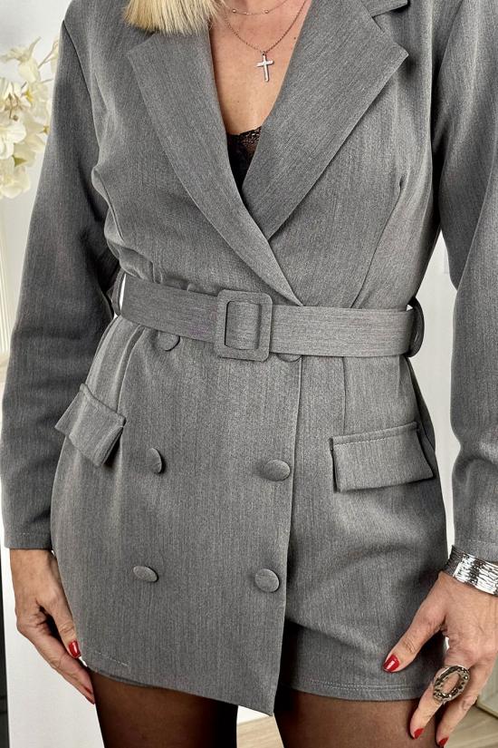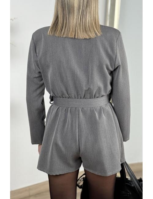 Short, stretchy, tailored blazer-style jumpsuit. Features six buttons and two faux flap pockets. Elasticated back waist, crossover fastening and fabric belt with buckle in the same fabric.