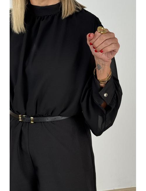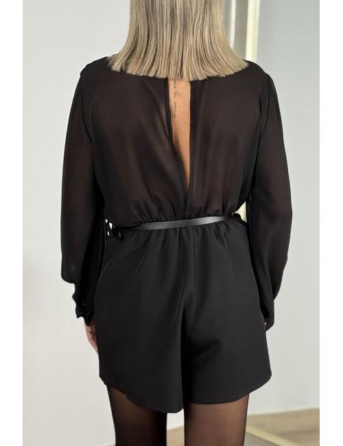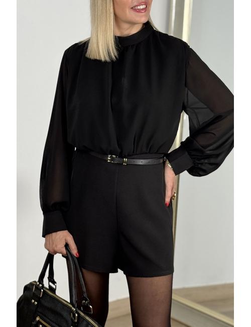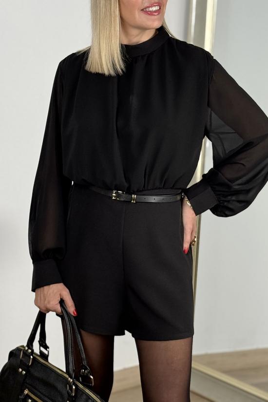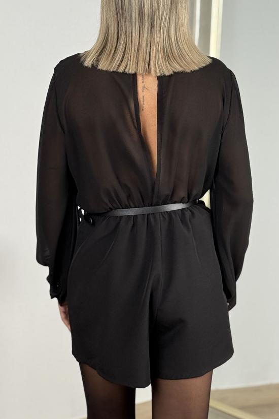 Short jumpsuit made from crepe with chiffon sleeves. Gold button detail on cuffs. Semi-transparent back and sleeves. Includes thin faux leather belt with rectangular gold buckle.
