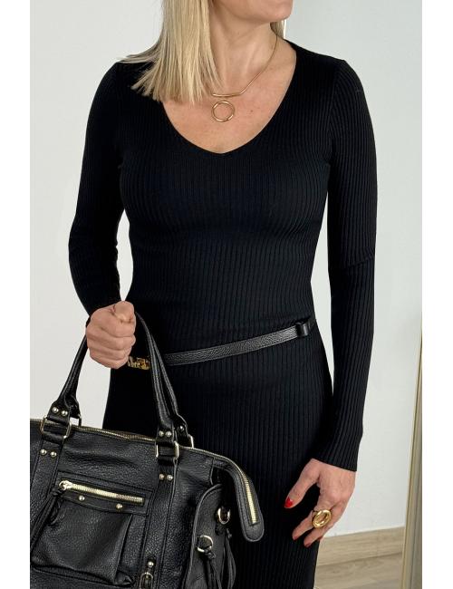 Long-sleeved midi dress made from stretchy ribbed knit fabric with a V-neck finish.