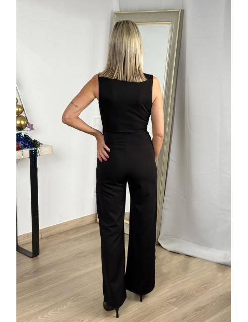 Long sleeveless wrap jumpsuit made from flowing crepe fabric. Gold buckle detail at the waist. Minimalist and elegant design.