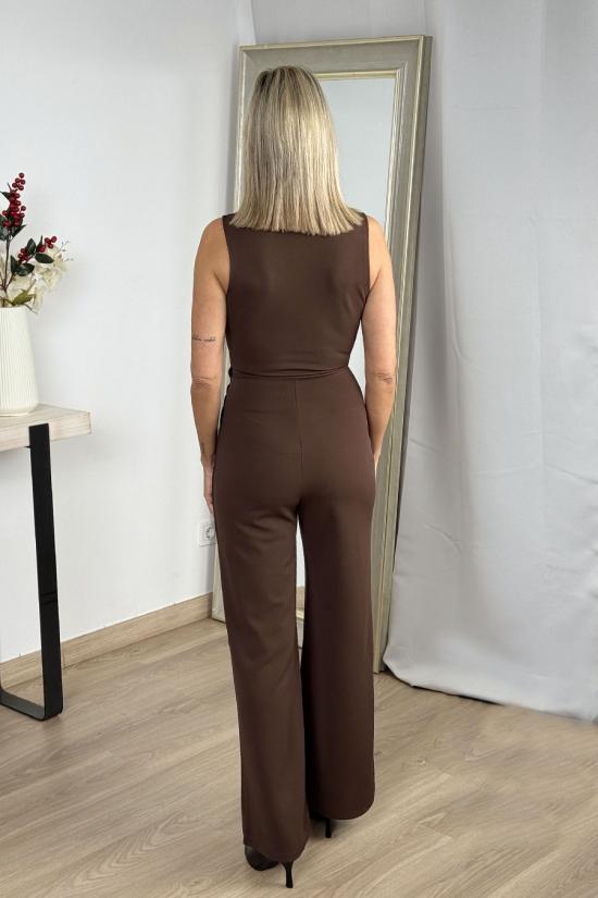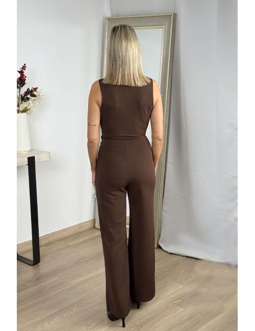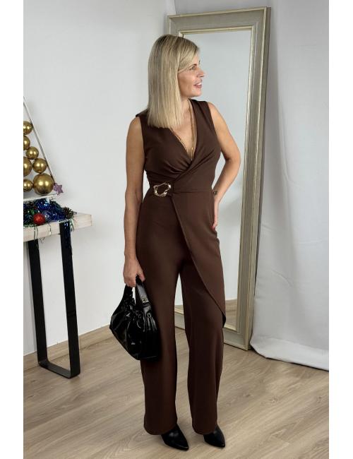 Long sleeveless wrap jumpsuit made from flowing crepe fabric. Gold buckle detail at the waist. Minimalist and elegant design.