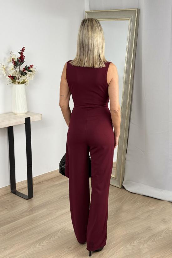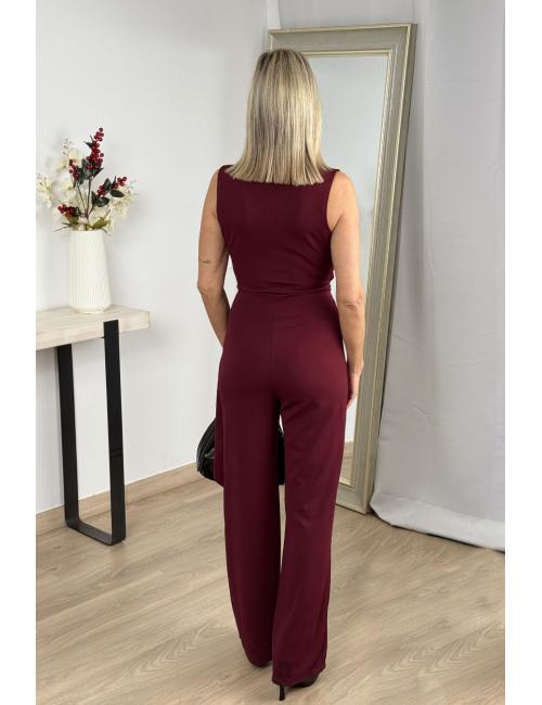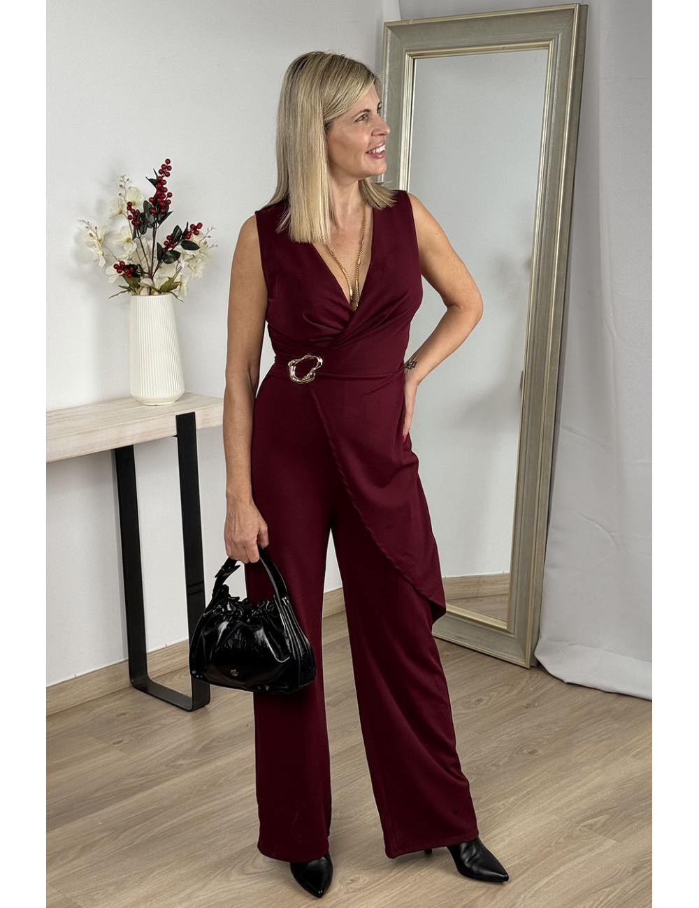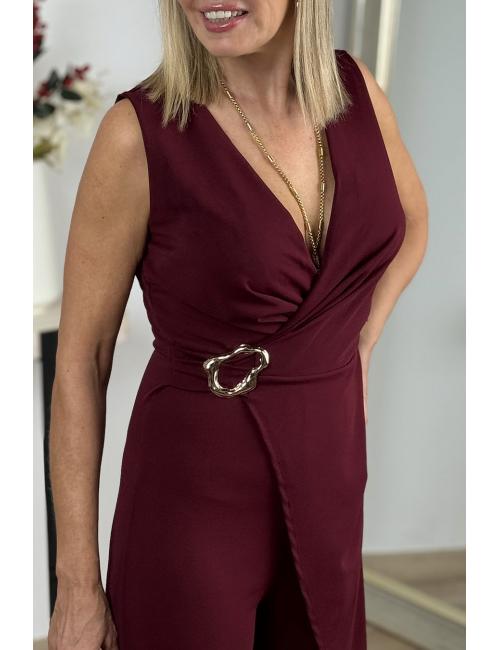 Long sleeveless wrap jumpsuit made from flowing crepe fabric. Gold buckle detail at the waist. Minimalist and elegant design.
