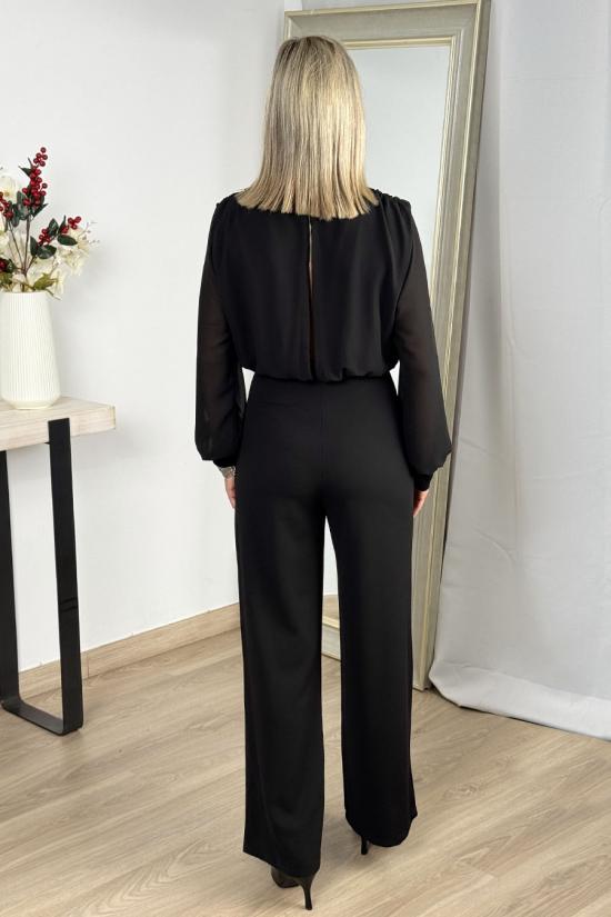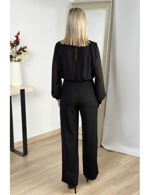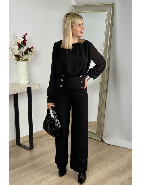 Long, flowing jumpsuit made from crepe and chiffon sleeves. Six gold buttons below the waist. Vertical opening at the back with button closure.