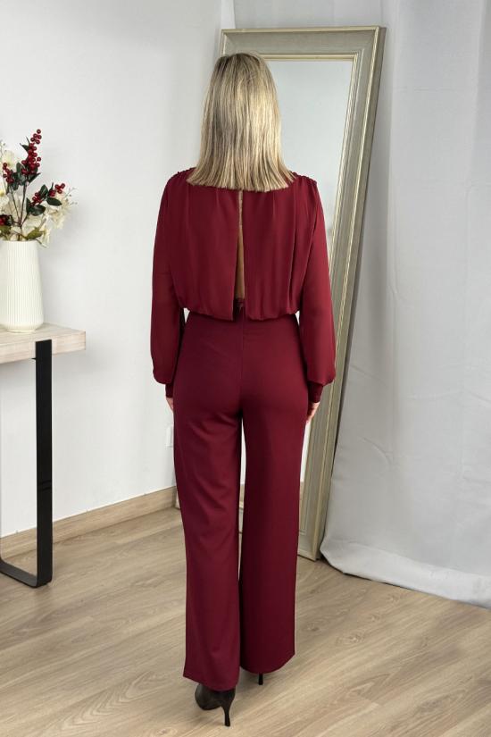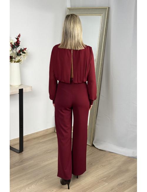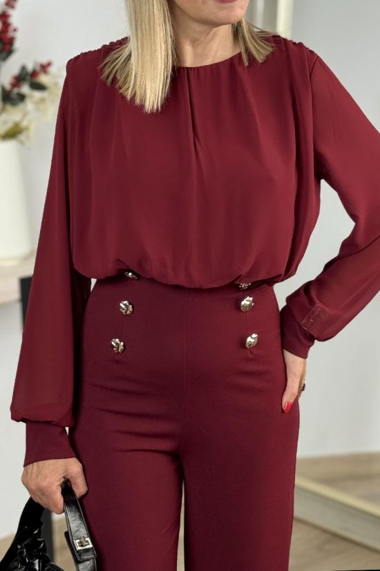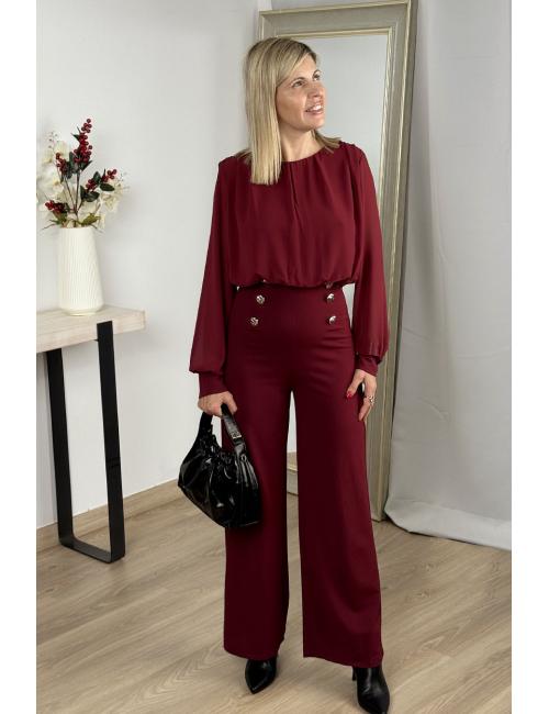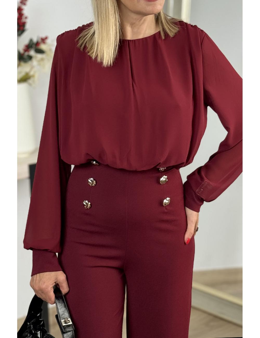 Long, flowing jumpsuit made from crepe and chiffon sleeves. Six gold buttons below the waist. Vertical opening at the back with button closure.
