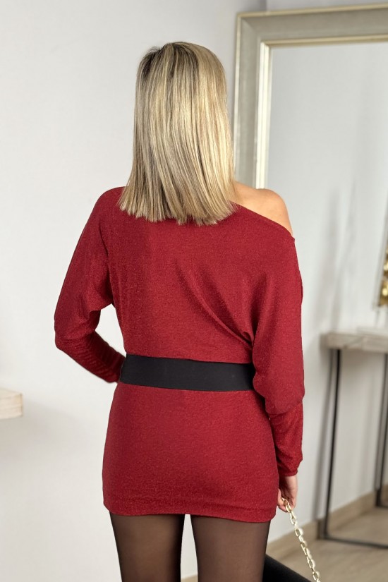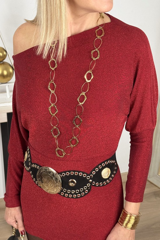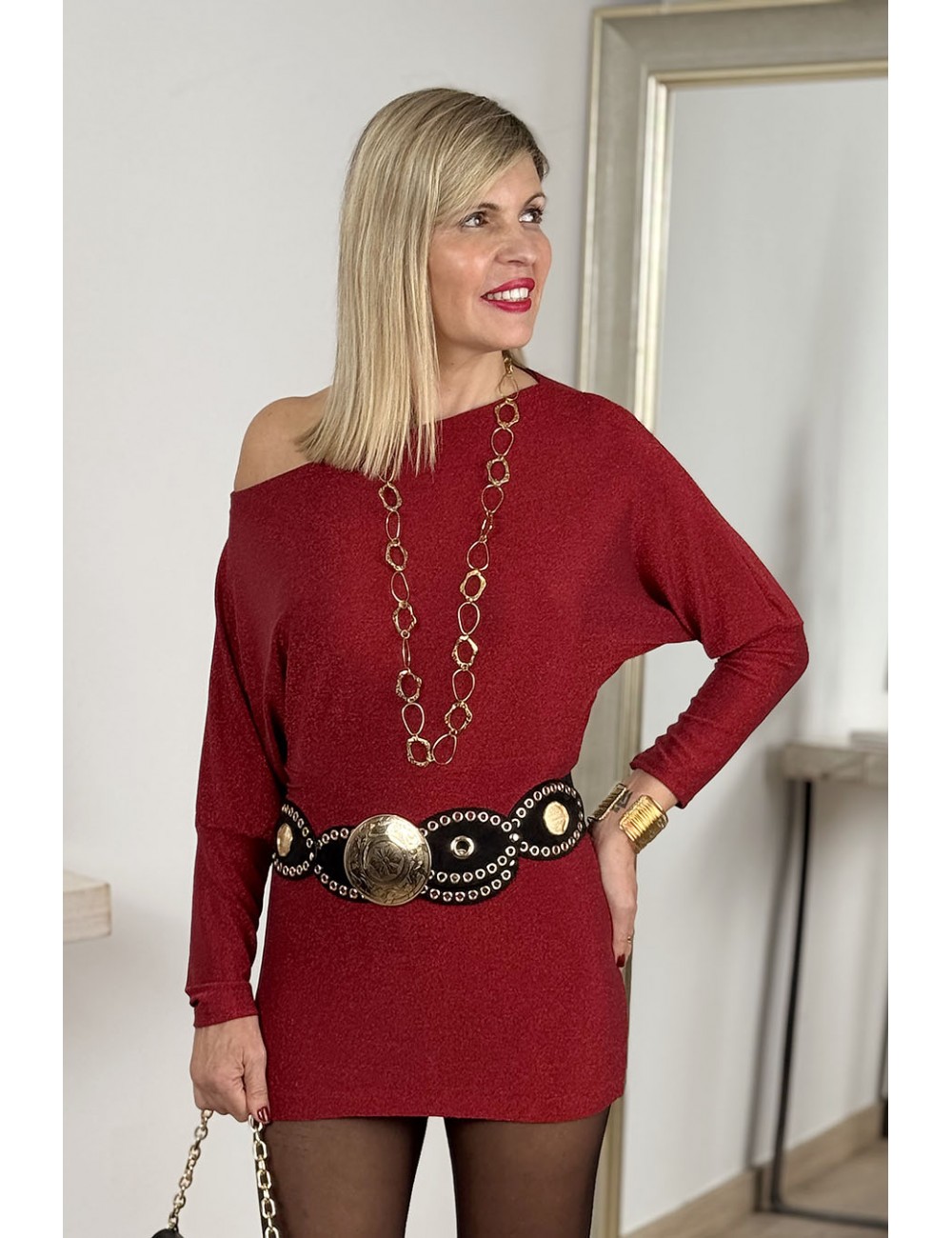 Short, long-sleeved dress made from shiny stretch lurex knit fabric. Batwing sleeves and semi-boat neckline.