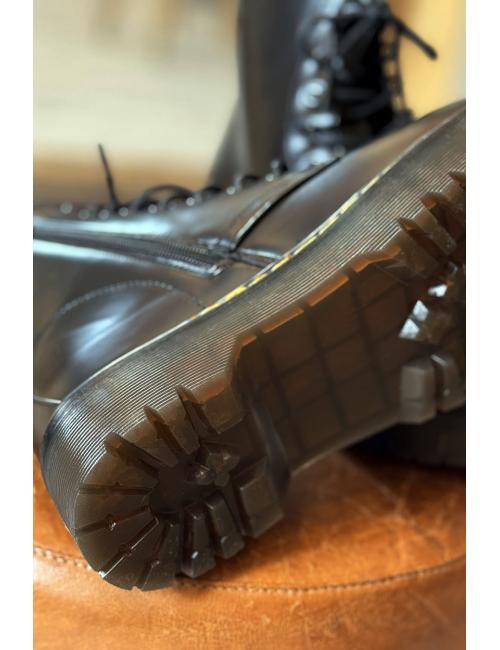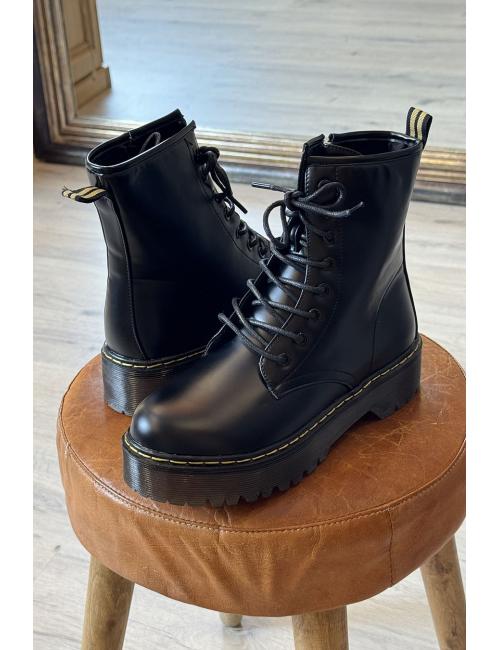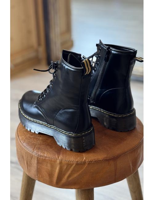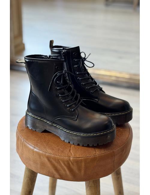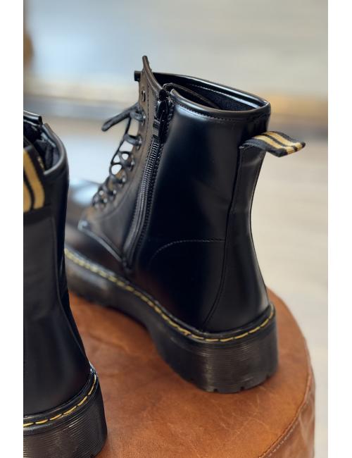 The military boot in its classic version with a lace-up front fastening. It also has a zip located on the inside side for a better fit and added comfort when putting on and taking off. The rubber sole provides comfortable and secure traction on slippery terrain. Made in black imitation leather, they have a contrasting yellow stitching on the upper contour of the sole and a pull tab on the back. The boot that is already a must for any wardrobe.