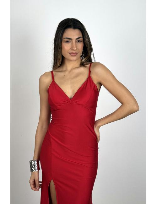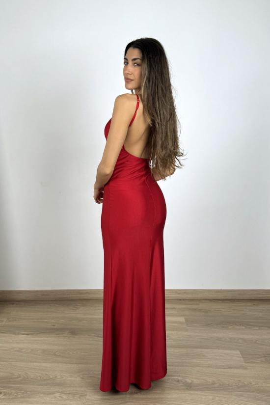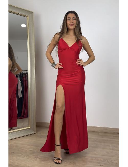 Shiny satin lycra dress. Stretch fabric, long and tight-fitting. Thin straps adjustable in height. Mermaid cut with ruching detail on the chest and back. It has a wide neckline at the back. V-neckline. A dress especially suitable for evening events or graduations.