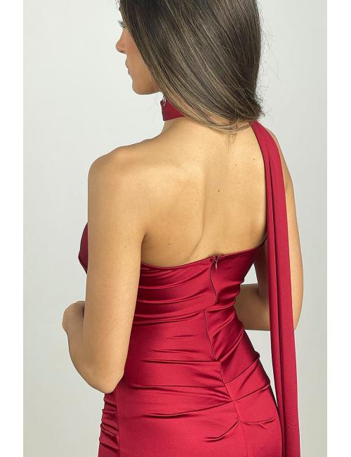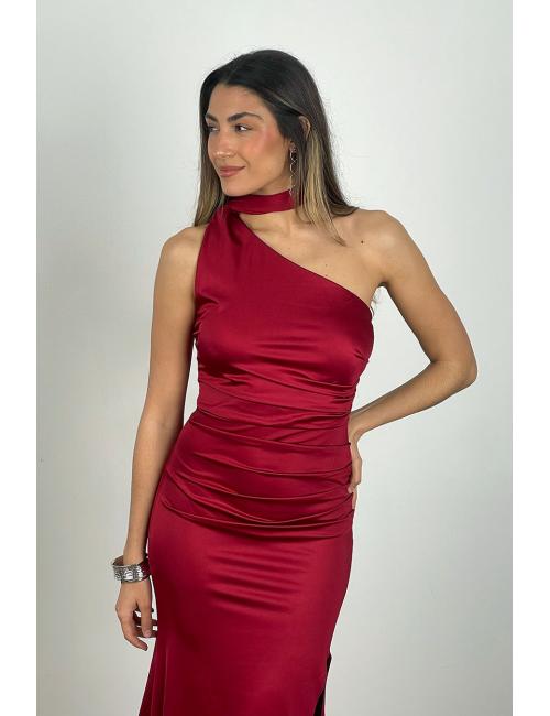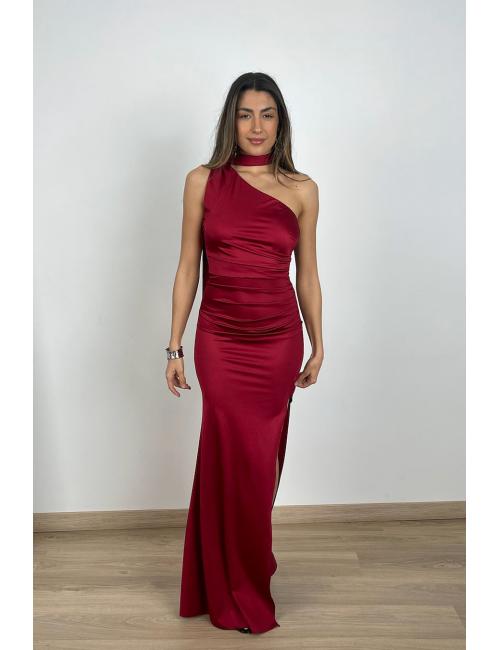 Long dress in shiny satin satin. Asymmetrical top with a single wide strap and bare shoulder. Draping on chest and waist. Back zip fastening. Side slit. Long bow detail, extending the shoulder strap. Dress suitable for evening events and graduations.