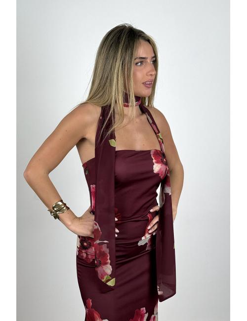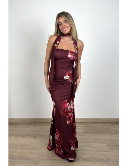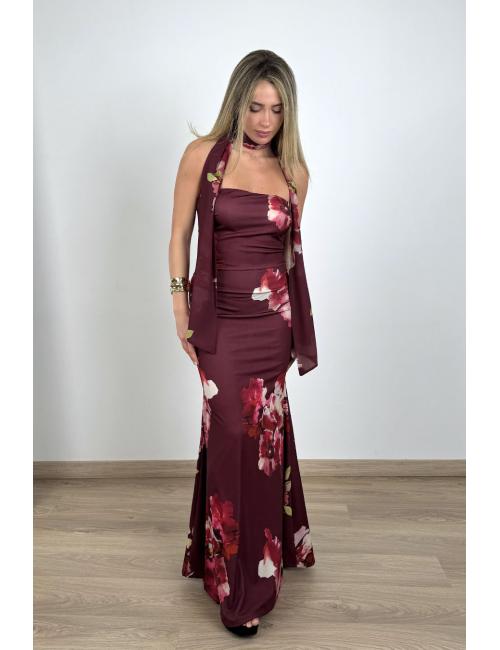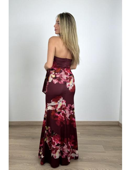 Long flowing dress in elastic satin satin and large watercolour flower print. Strapless neckline. Includes sling in the same fabric. Long dress for events, weddings, christenings and graduations.