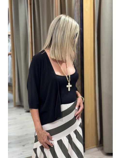 Fine knit jacket without buttons and three-quarter sleeves. An ideal jacket for those cool summer evenings.