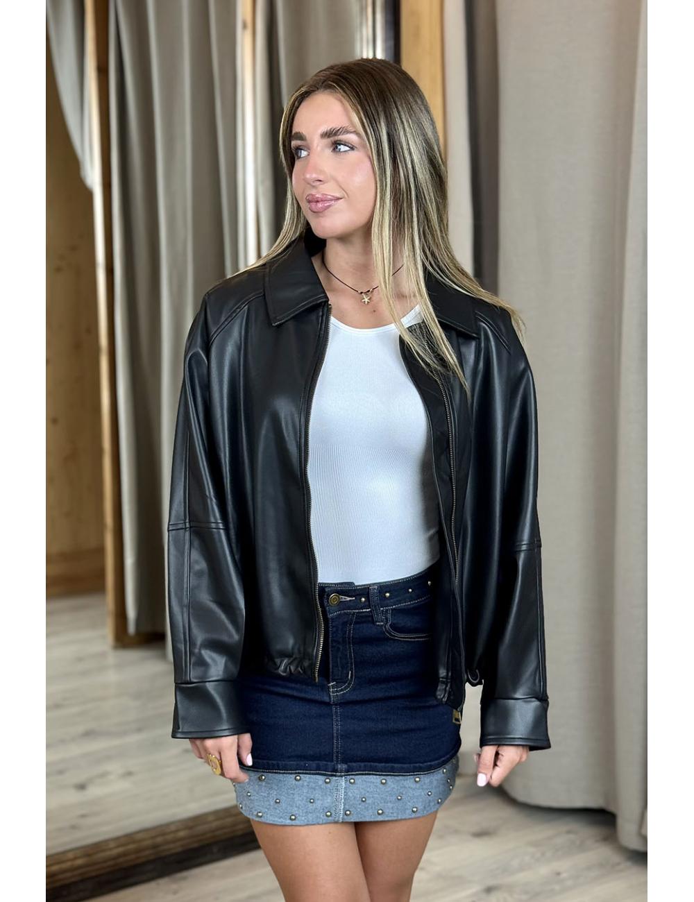 Oversized leather-effect jacket with shirt collar and wide sleeves. Straight hem adjustable with drawstrings for a customised fit. Zip fastening and two side pockets.