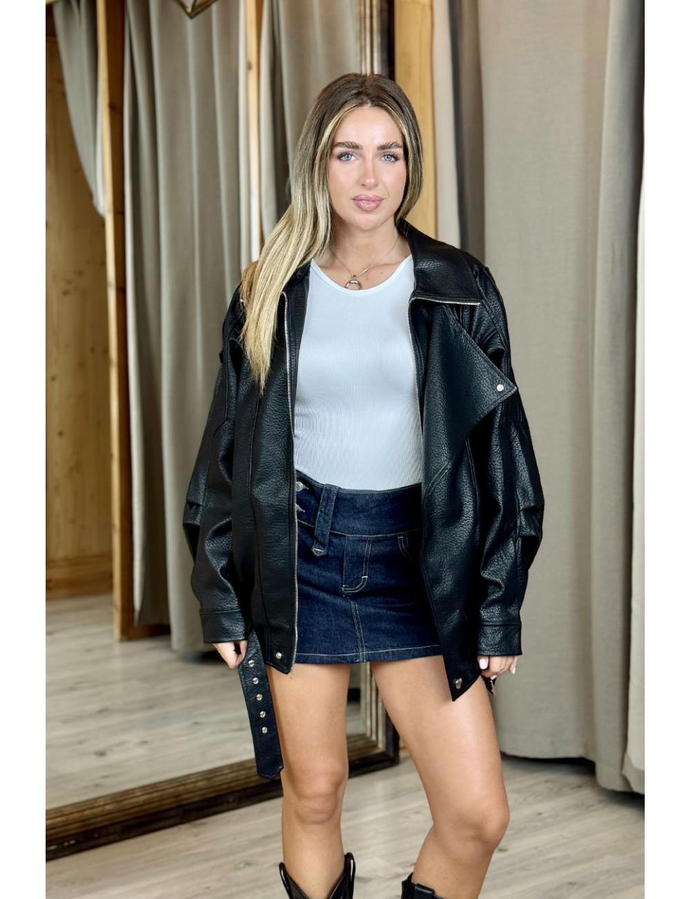 Oversized leather-effect jacket with shirt collar and wide sleeves. Straight hem adjustable with drawstrings for a customised fit. Zip fastening and two side pockets.