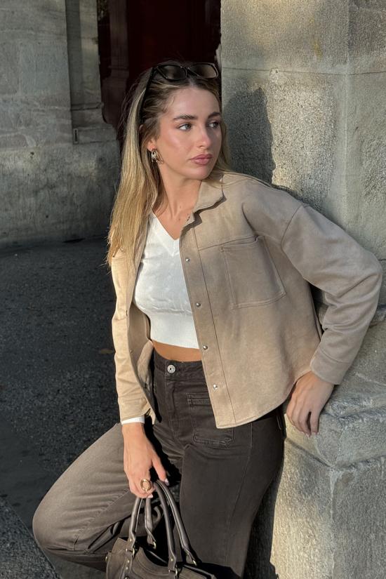 Short jacket made from chocolate brown suede. Shirt collar, two front pockets and metal press stud fastening.