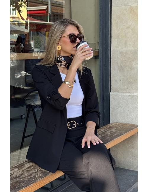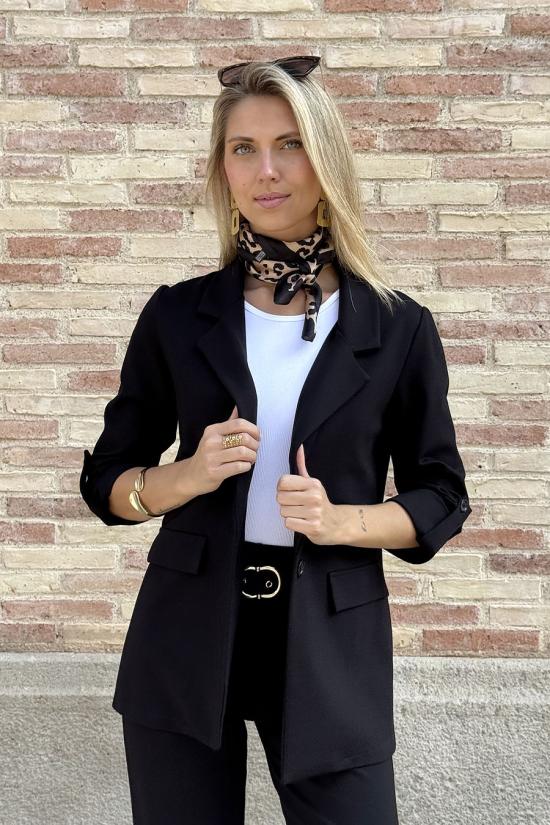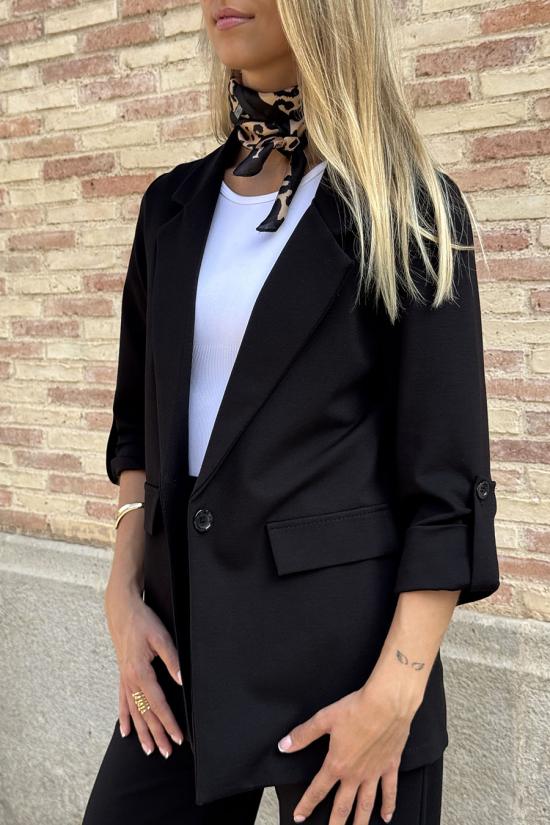 Classic blazer with tailored lapel, single-button closure and sleeves rolled below the elbow, finished with a turn-up and button loop. Two front pockets with flaps.