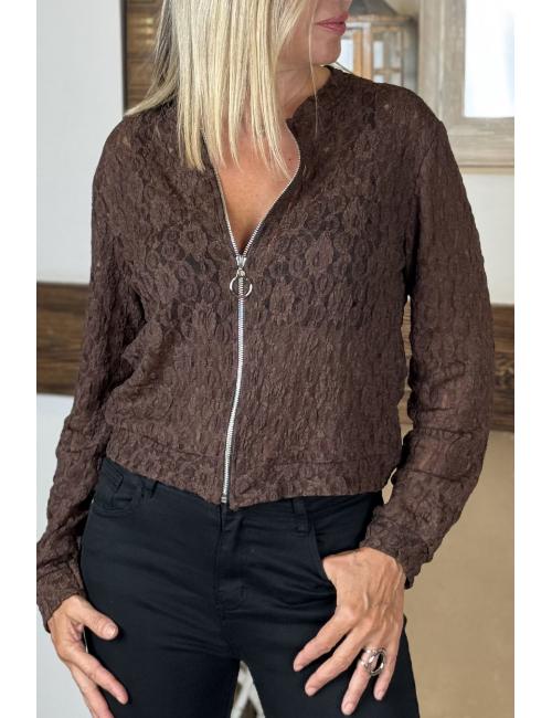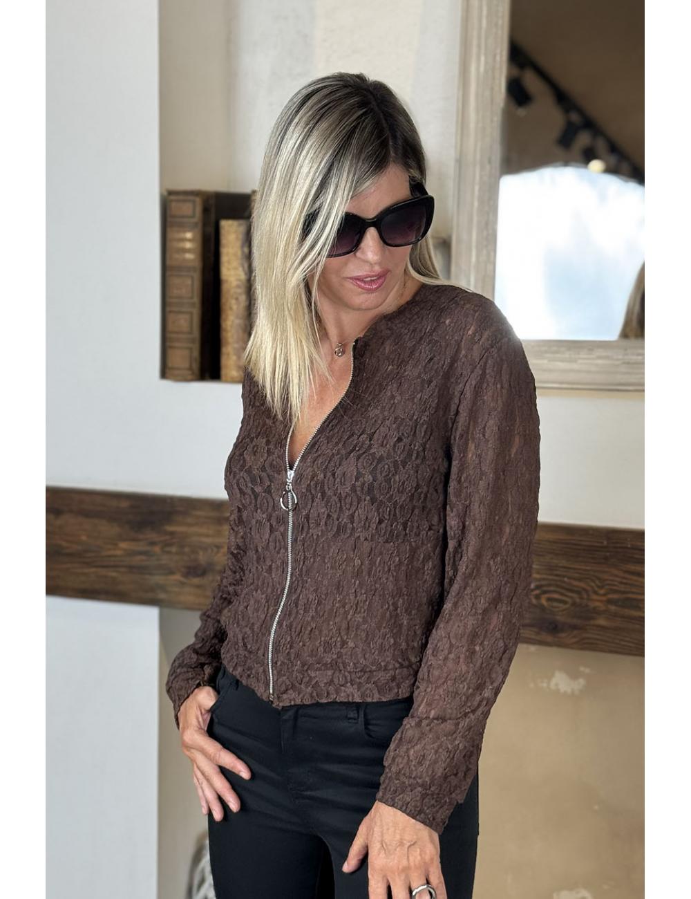 Bomber jacket made from semi-transparent lace. Zip fastening and round neckline. A lightweight, mid-season jacket with a unique and original design to add a special touch to your everyday or weekend looks.