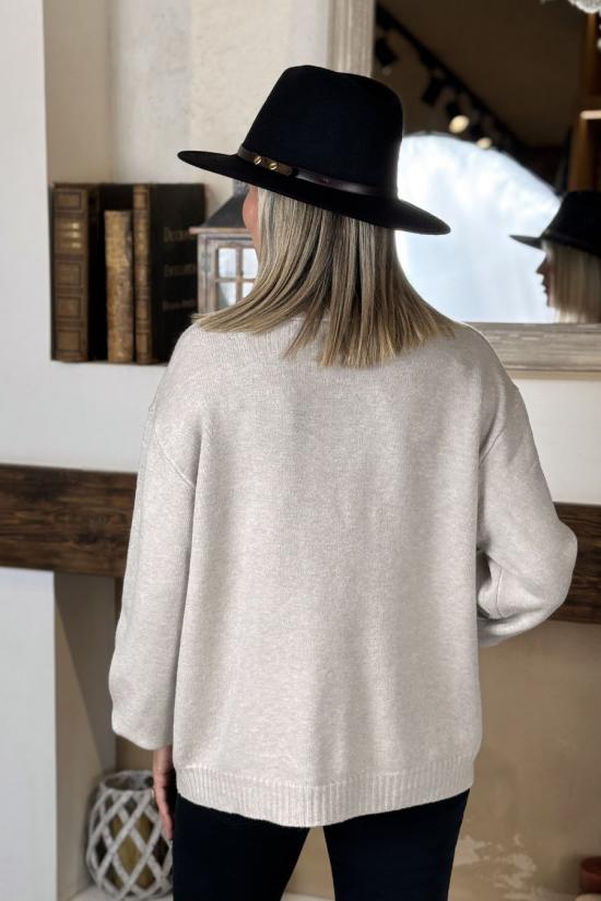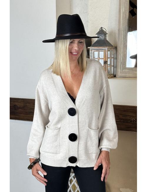 Oversized jacket made from fine knit fabric. V-neck, two front pockets, front fastening with three large mother-of-pearl buttons. Ribbed cuffs and collar.