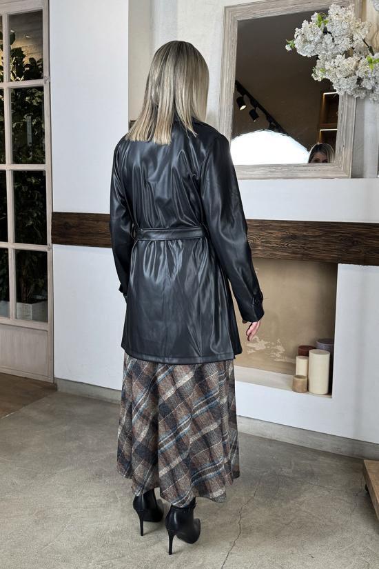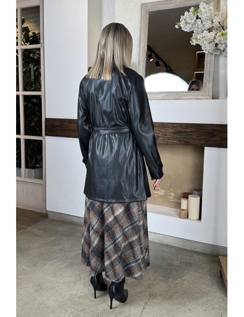Faux leather trench coat with two side pockets and four-button closure. Long sleeves with buttoned cuffs. Includes a belt and two belt loops in the same colour and fabric.