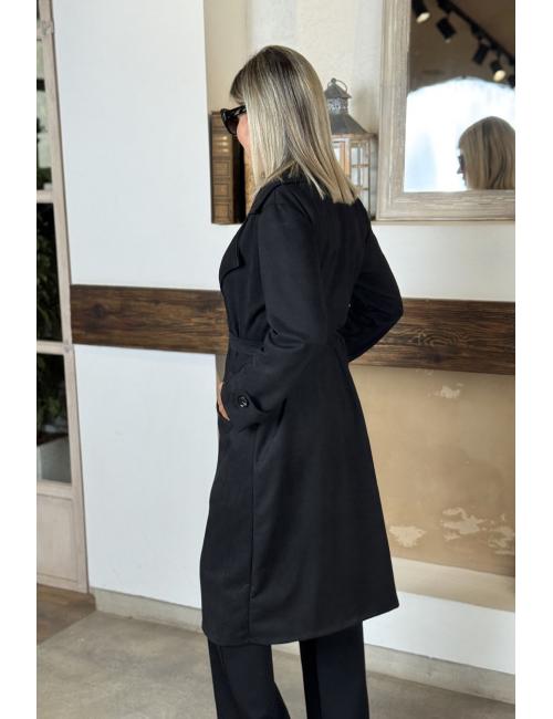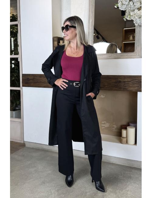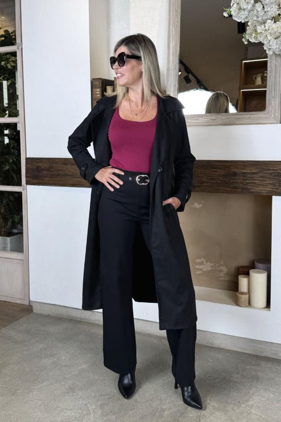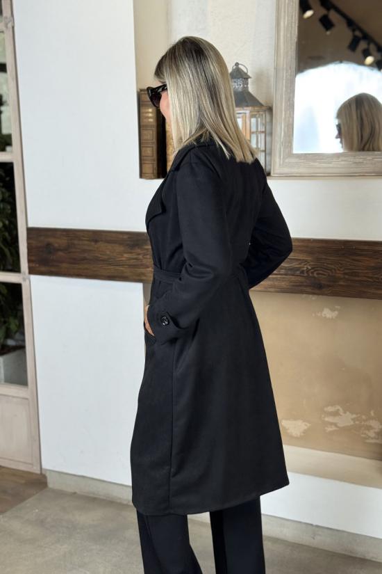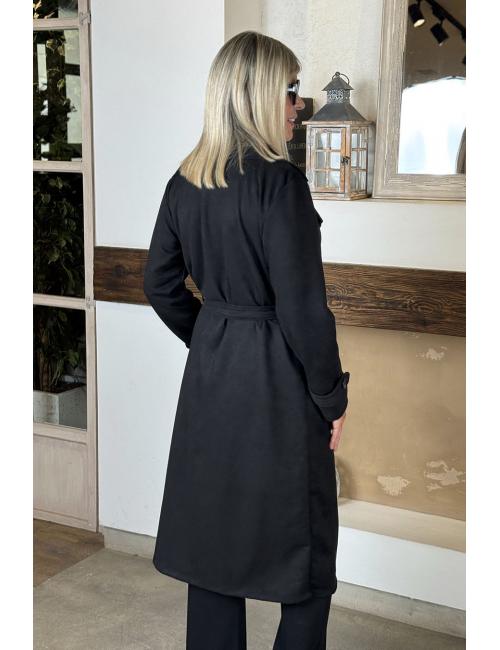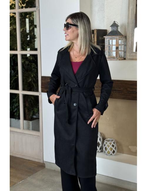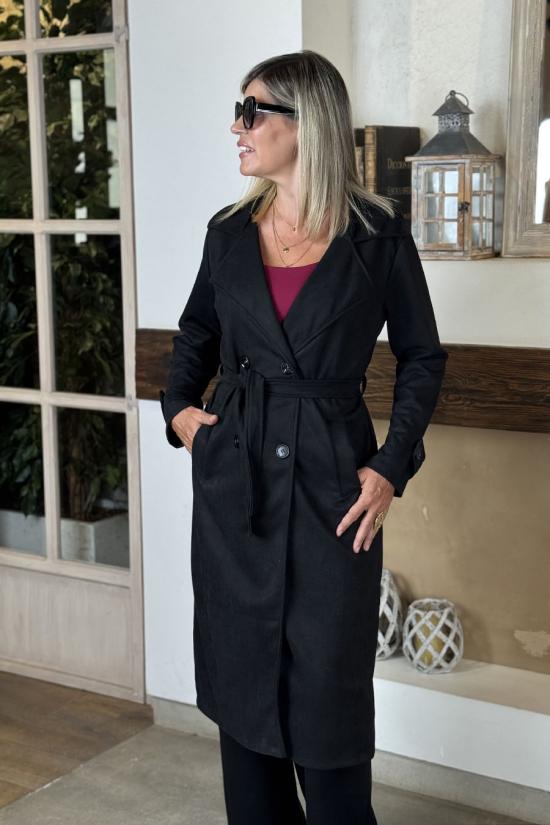 Long trench coat made of suede with two side pockets and four-button closure. Long sleeves with buttoned cuffs. Includes a belt and two belt loops in the same colour and fabric.