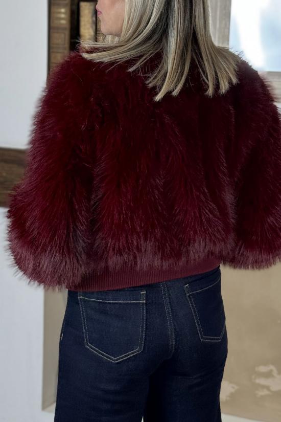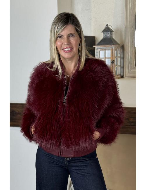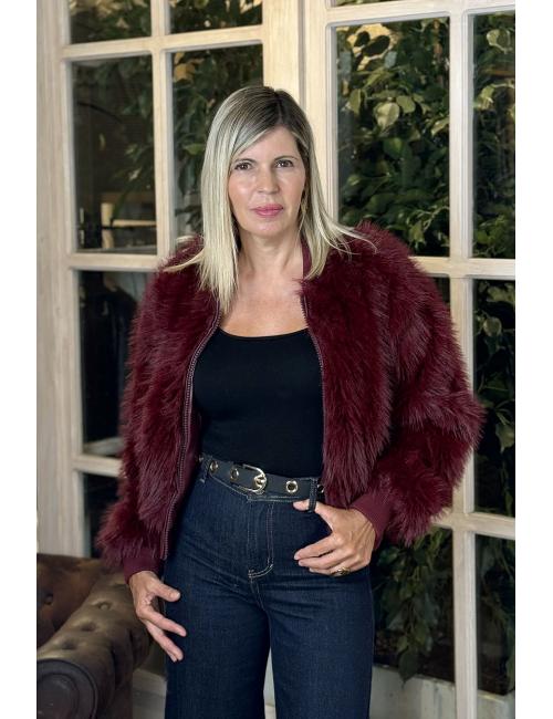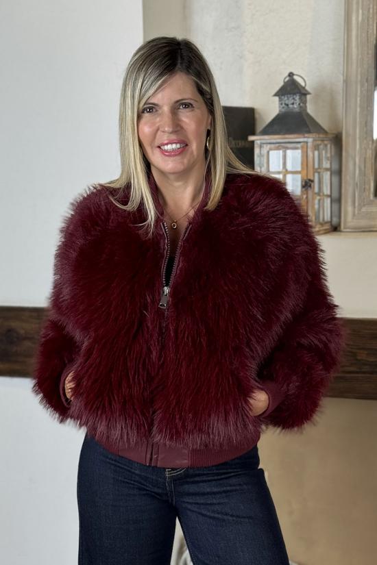 Bomber jacket made from super-soft faux fur fabric. Round neck and ribbed cuffs. Front zip fastening. Two side pockets and satin lining.