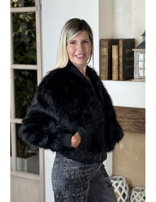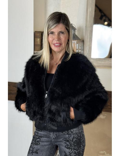 Bomber jacket made from super-soft faux fur fabric. Round neck and ribbed cuffs. Front zip fastening. Two side pockets and satin lining.