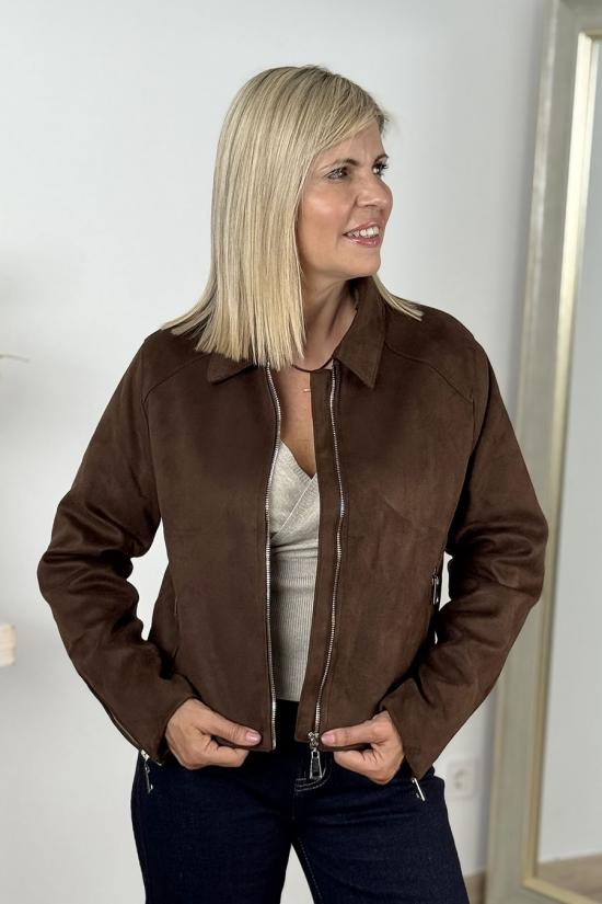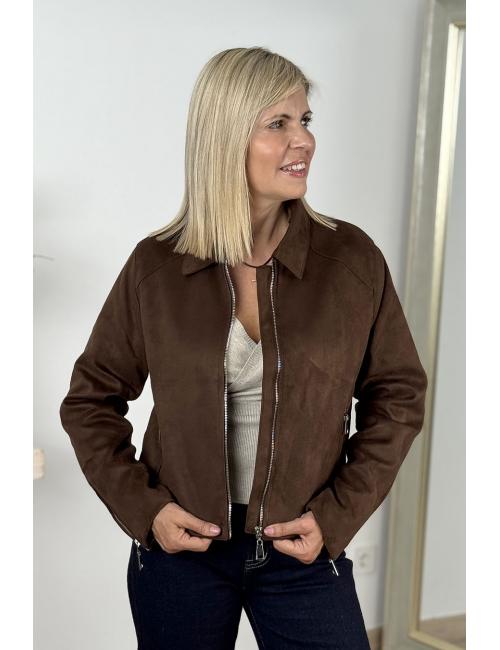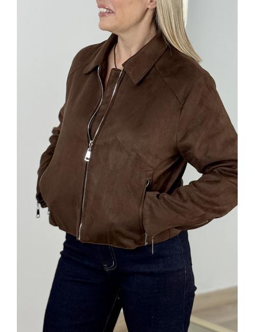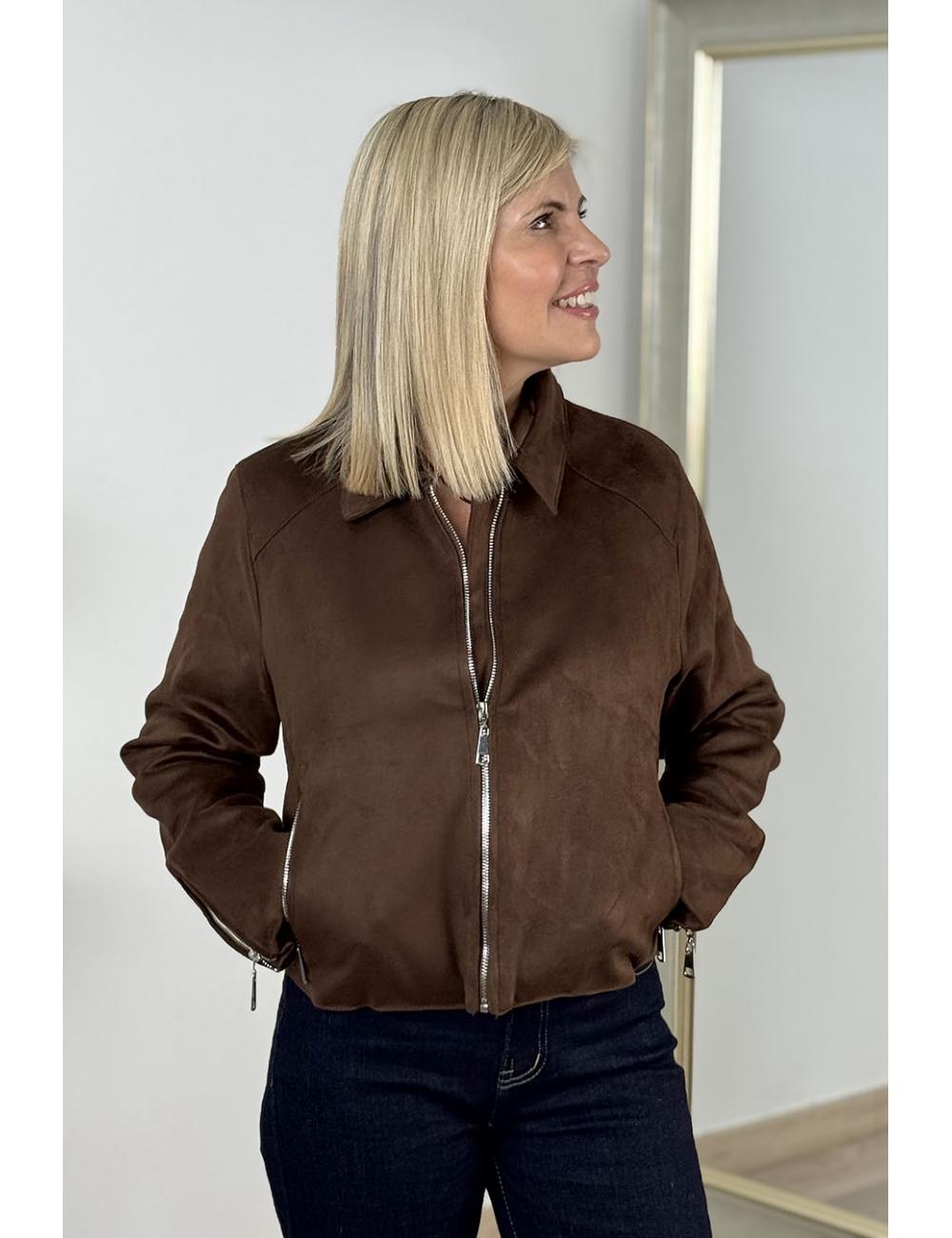 Short jacket made from chocolate brown suede. Zipper detail on the forearm, pockets and closure. Plain back and inner lining.