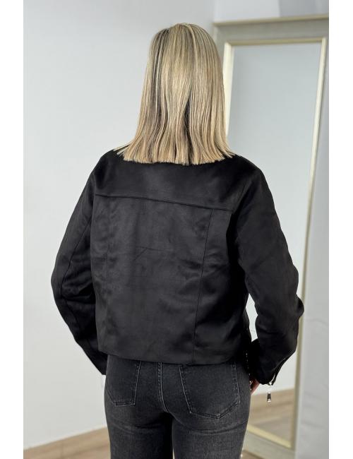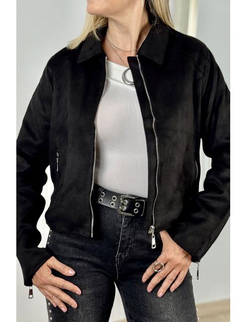 Short jacket made from chocolate brown suede. Zipper detail on the forearm, pockets and closure. Plain back and inner lining.