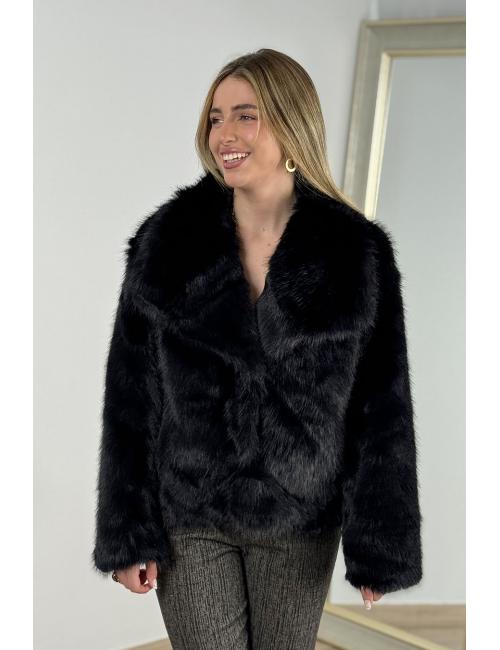 Jacket made from extremely soft synthetic fur fabric. Oversized lapel collar, front closure with magnetic metal button and two side pockets. Satin satin lining detail inside.