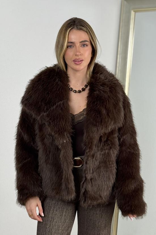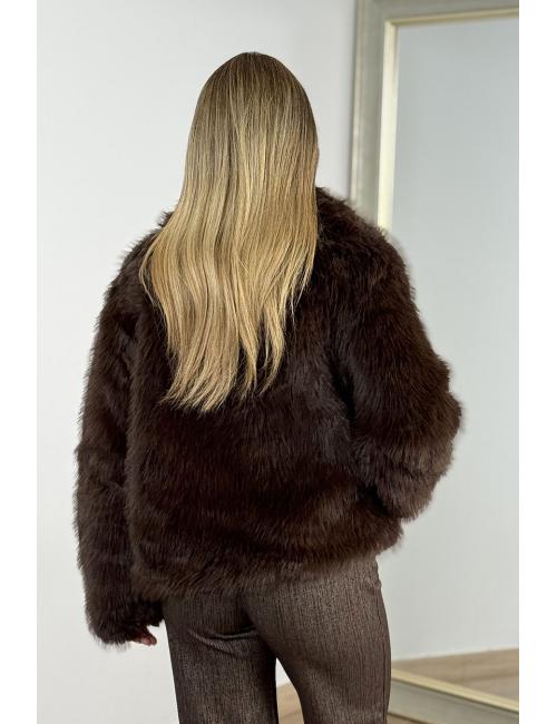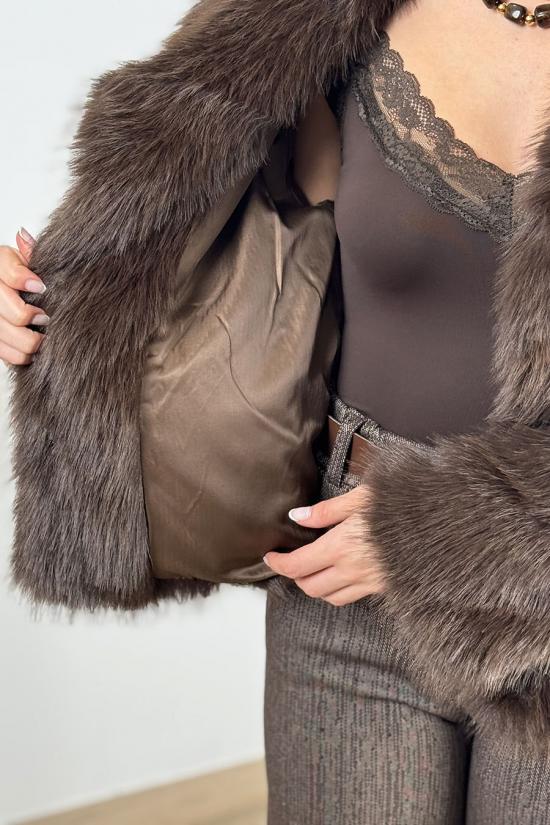 Jacket made from extremely soft synthetic fur fabric. Oversized lapel collar, front closure with magnetic metal button and two side pockets. Satin satin lining detail inside.