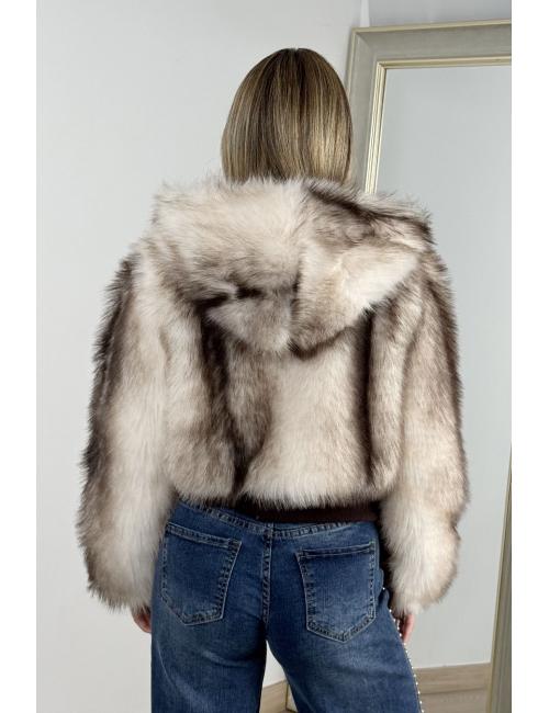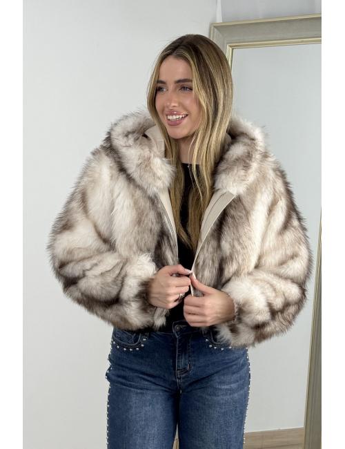Short jacket made from extremely soft synthetic fur fabric. Zip fastening and two side pockets. Satin satin lining detail inside.