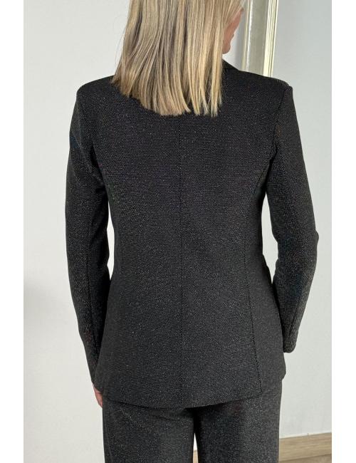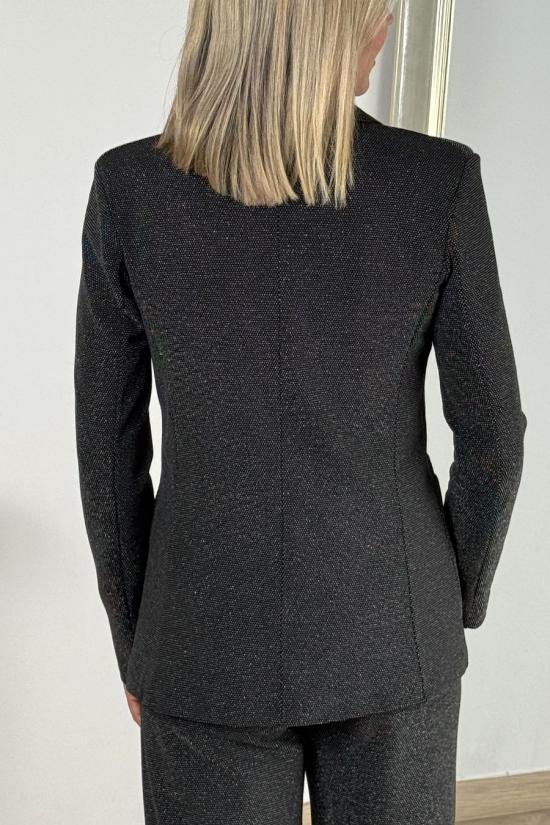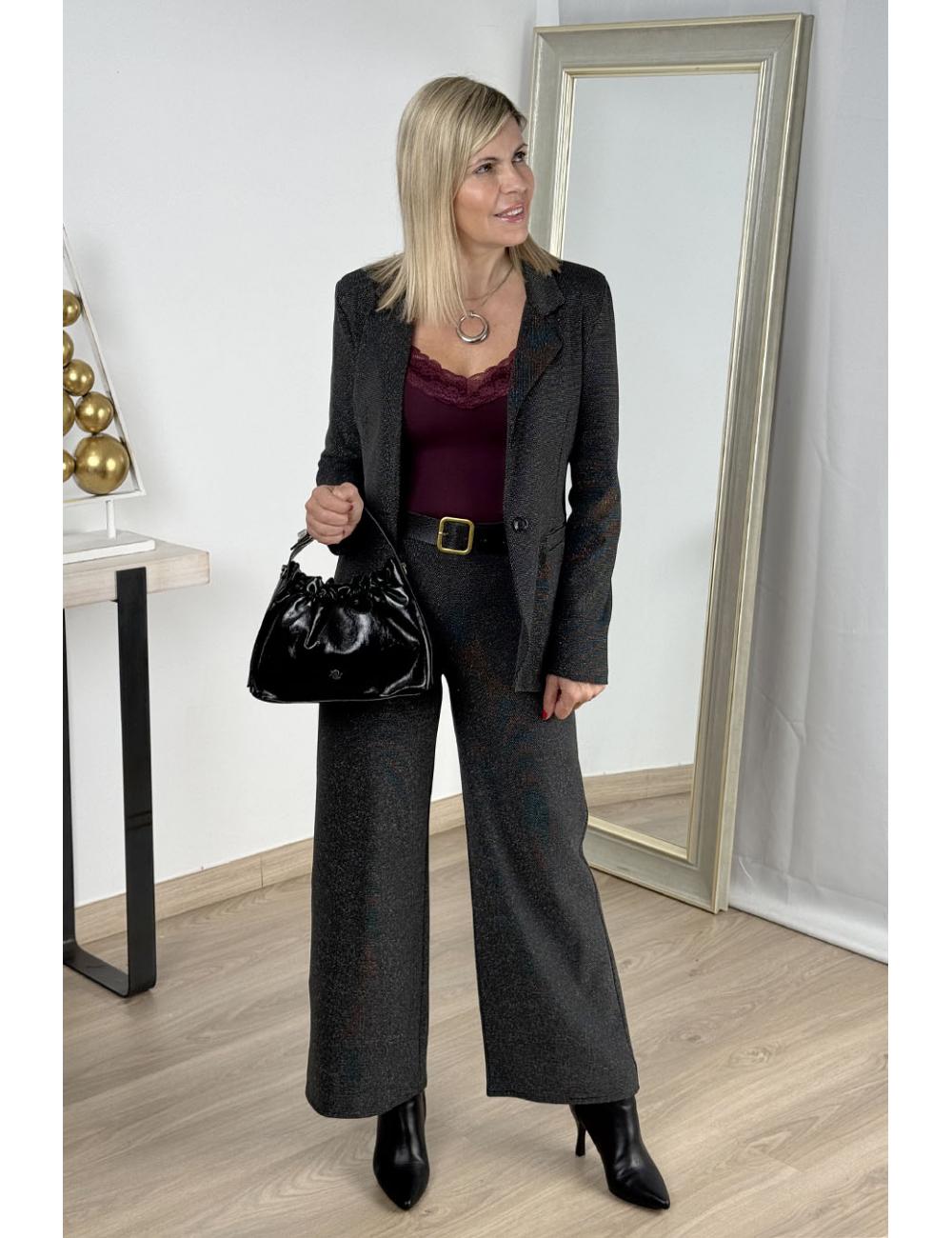 Suit trousers made from stretch knit fabric combined with shiny lurex in a herringbone pattern. Palazzo cut and mid-rise. Includes a faux leather belt with a gold buckle.