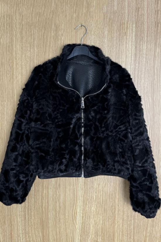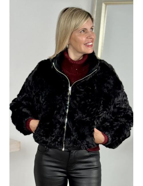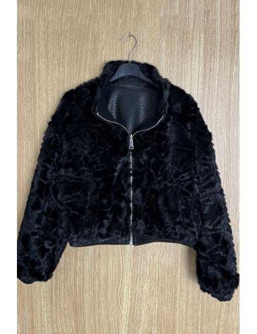 Short reversible jacket in textured faux leather and sheepskin. High collar, two side pockets with zip fastening on the faux leather version and without zip on the sheepskin version. Zip fastening. A jacket you'll love for its modern, timeless cut and the versatility of its fabrics, which allow you to combine it with all kinds of outfits.