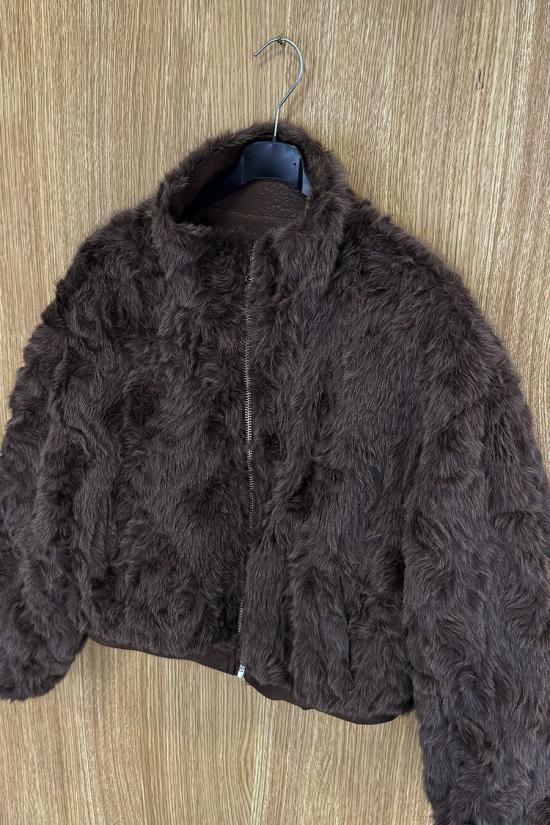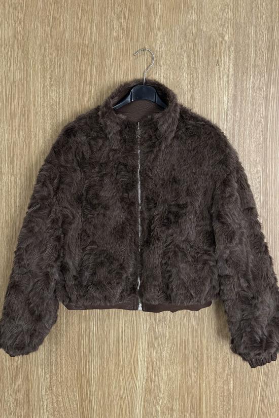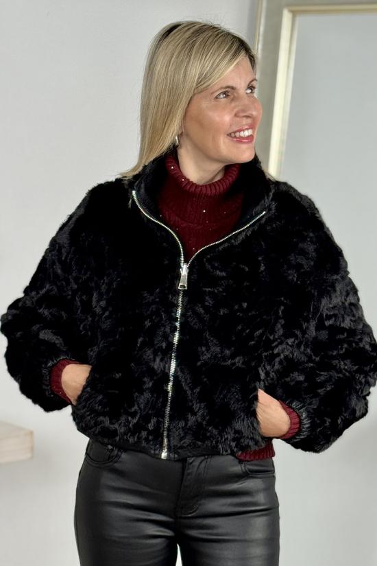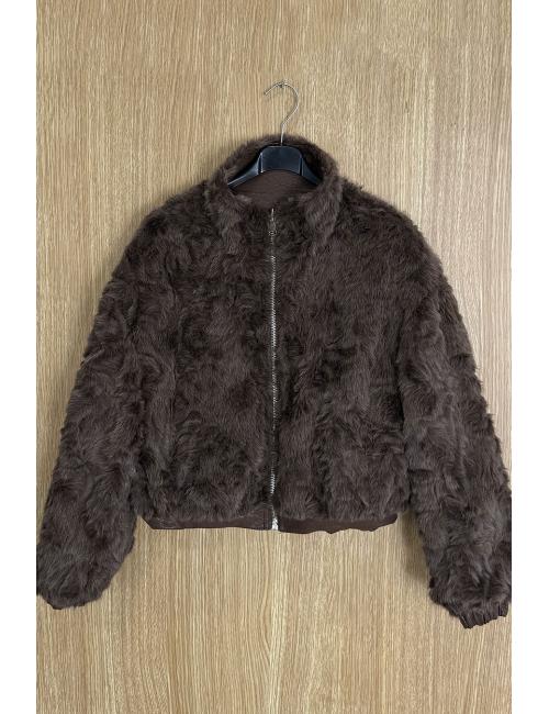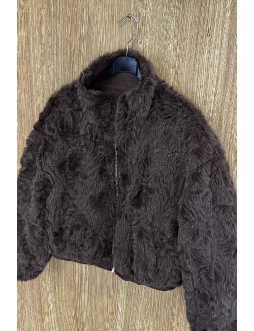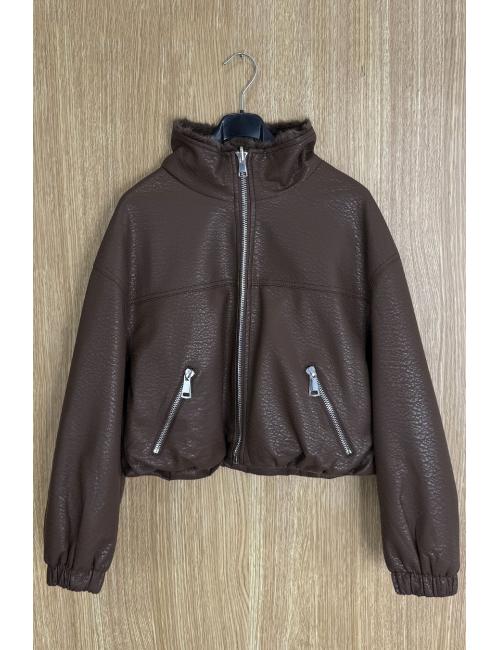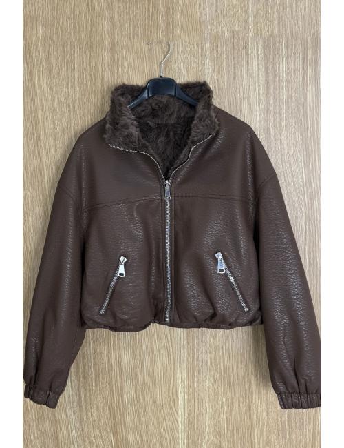 Short reversible jacket in textured faux leather and sheepskin. High collar, two side pockets with zip fastening on the faux leather version and without zip on the sheepskin version. Zip fastening. A jacket you'll love for its modern, timeless cut and the versatility of its fabrics, which allow you to combine it with all kinds of outfits.