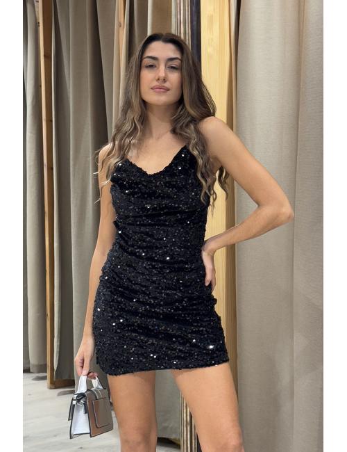 Short dress made of velvet and sequins. Sleeveless and tied with two straps in the back. Waterfall neckline.