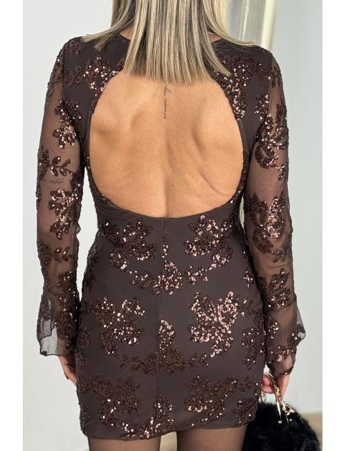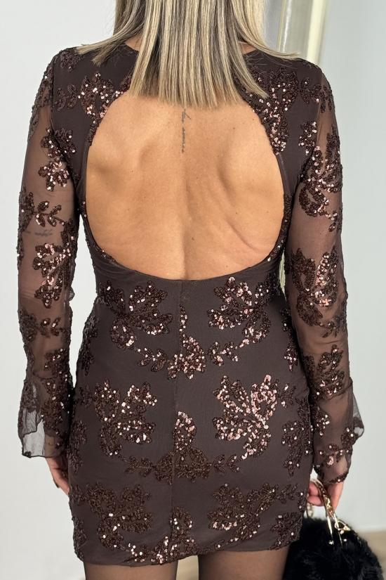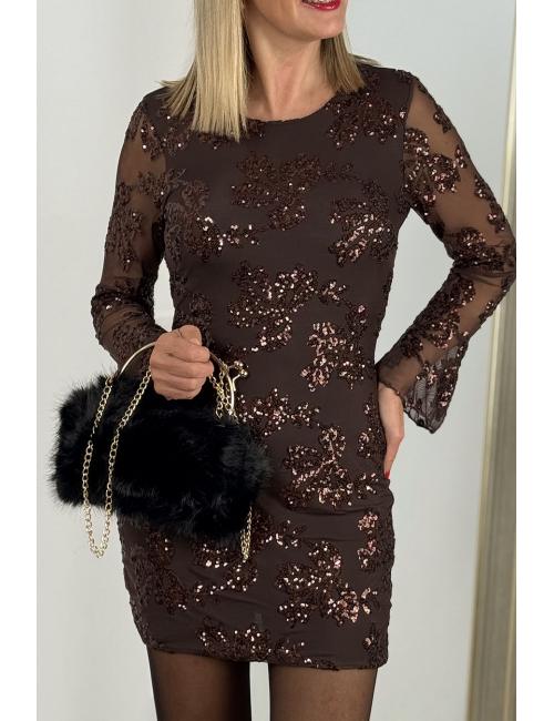 Short, stretchy sequined dress made from two fabrics. Semi-sheer bell sleeves, round neckline with a button closure at the back. Pure glamour for your parties and special celebrations with this elegant and sophisticated dress.
