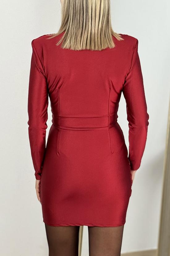 Short, long-sleeved dress with shoulder pads. Stretchy, made of Lycra. Shoulder pads. Plain covered back and double-layered, crossover ruched bodice.