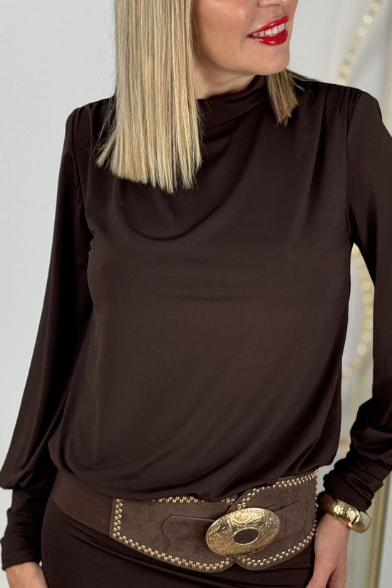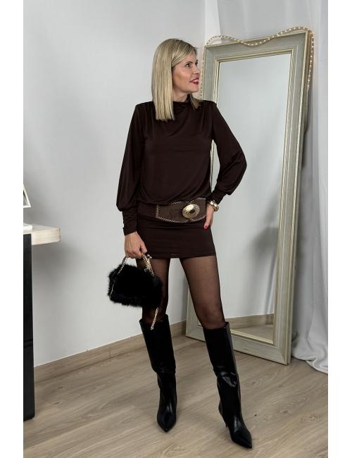 Short, long-sleeved dress made from stretchy, shiny satin fabric. Features an elasticated sash at the waist, puff sleeves with shoulder pads, a halter neckline, and an open back with a cascading neckline.