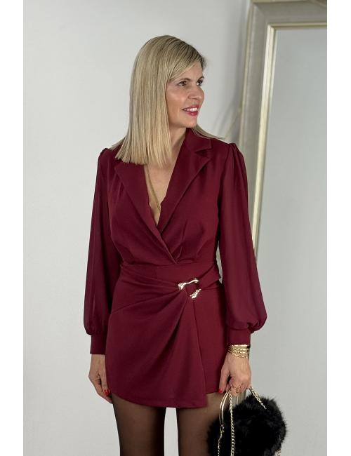 Short jumpsuit with long sleeves made of crepe with chiffon sleeves. Double-breasted blazer design and puff sleeves. Gold metal buckle detail at the waist.