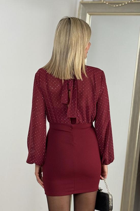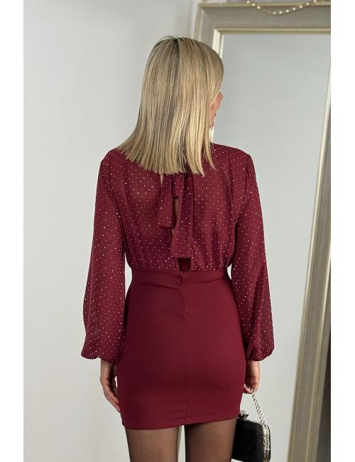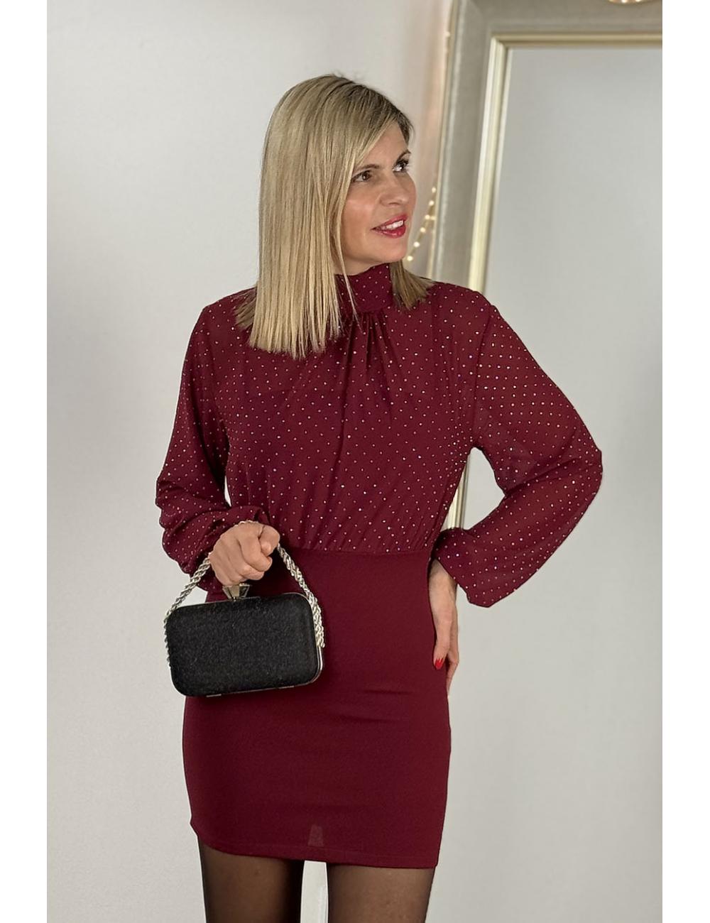 Short, long-sleeved dress made from two fabrics: crepe for the skirt and strapless neckline, and a semi-sheer chiffon bodice lined with mini sequins. Halter neck and invisible zipper closure at the back.