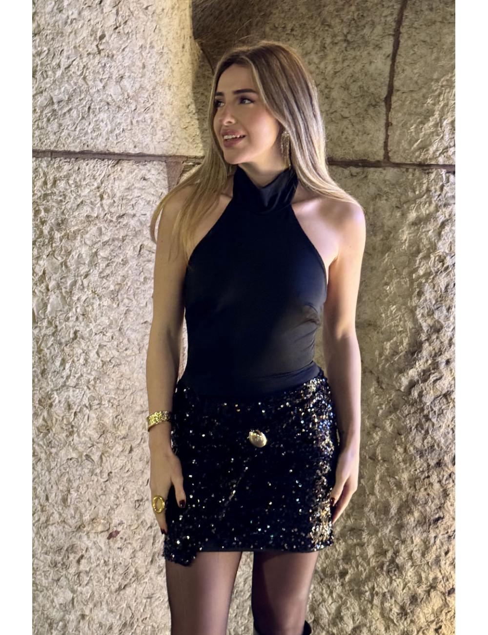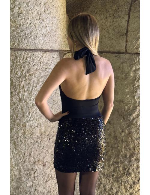 Short, sleeveless dress made with lycra on the top and sequins on the bottom. Halter neckline tied at the back with a bow. Open back and a decorative gold detail on the skirt, resembling a buckle. Total glamour for your party looks with this elegant, comfortable, and original dress.