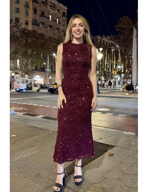 Sleeveless midi dress made of sequined fabric. Flared hem and fine knit lining. Round neck with button closure at the back. Open back.