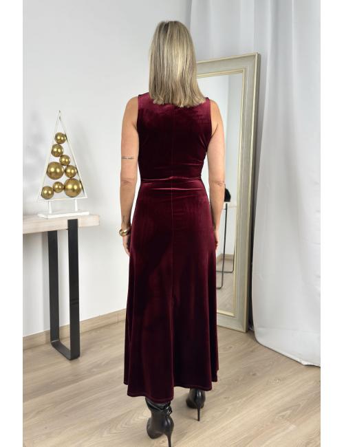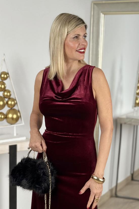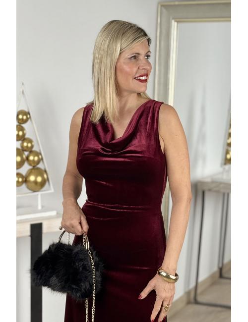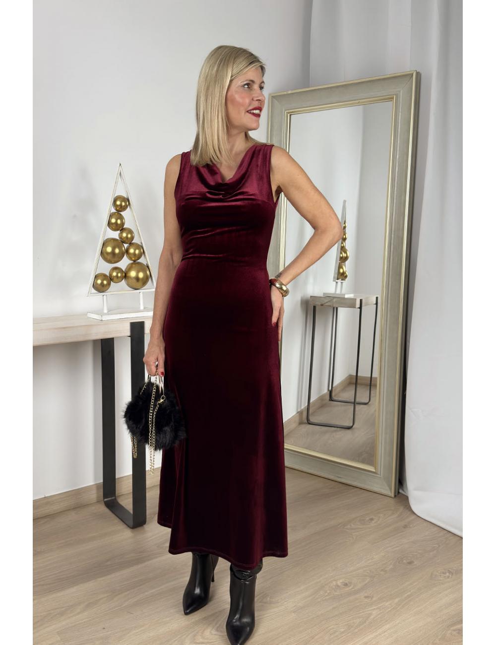 Long, sleeveless, stretchy velvet dress. Fitted at the waist, flared hem, and cascading neckline. A sure hit for Christmas Eve, New Year's Eve, or your office party.