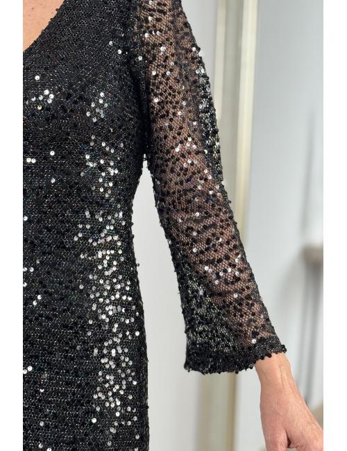This long-sleeved, stretchy midi dress features a deep V-neck, shimmering sequin detailing over mesh, a sheer hem, and a mid-length lining.