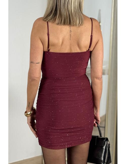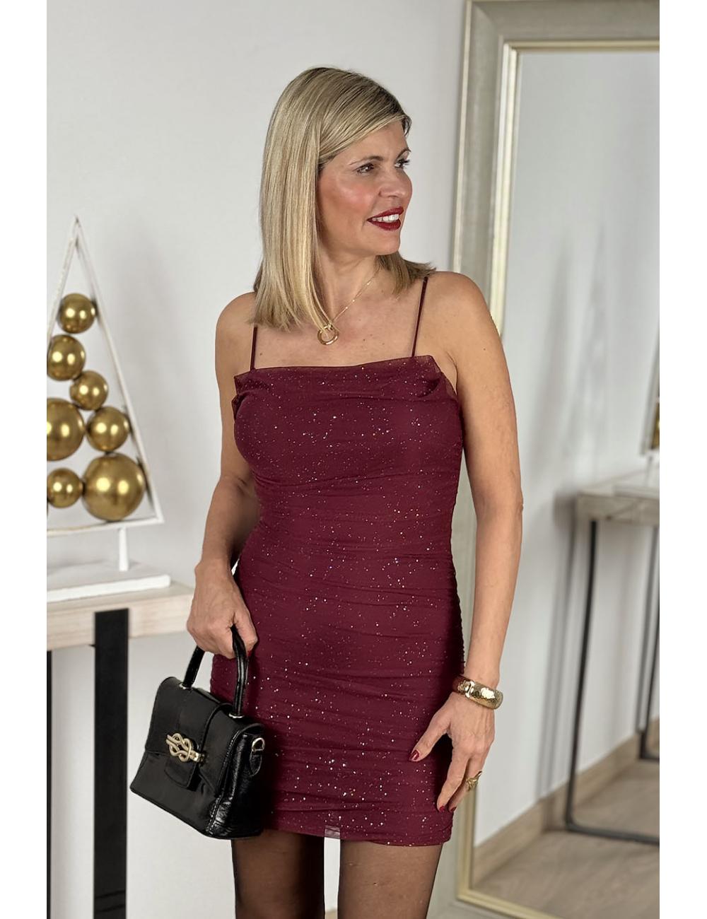 Short, stretchy dress made of tulle with sequins. Draped, with cups at the bust and adjustable straps for a perfect fit.