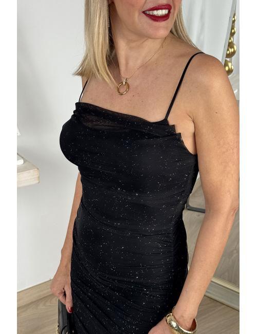 Short, stretchy dress made of tulle with sequins. Draped, with cups at the bust and adjustable straps for a perfect fit.
