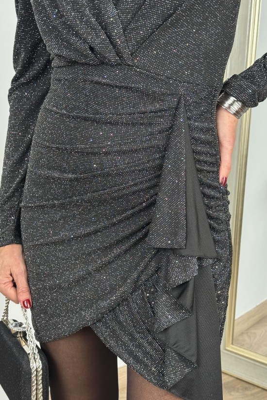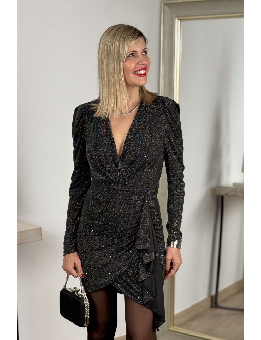 Long, stretchy tulle dress with satin ribbon flower details. V-neck and open back with a tie at the back. Features include cups, shoulder pads, a side ruffle, and lining.