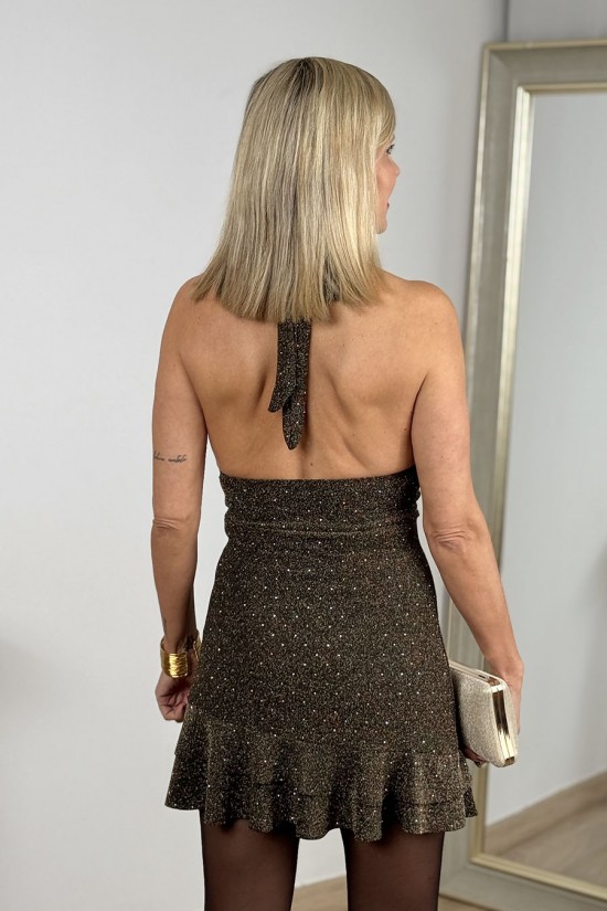 Short, stretchy dress made of shimmering lurex with mini sequins scattered throughout. Features an irregularly shaped metal buckle at the waist, a V-neckline, and ties at the back with two straps. Flared hem and open back.